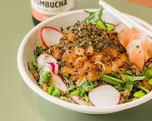 Salmon sashimi , pickled ginger, cucumber, edamame, baby rocket, cabbage slaw, nori crunch, radish, burnt leek and sesame dressing (GF/DF)