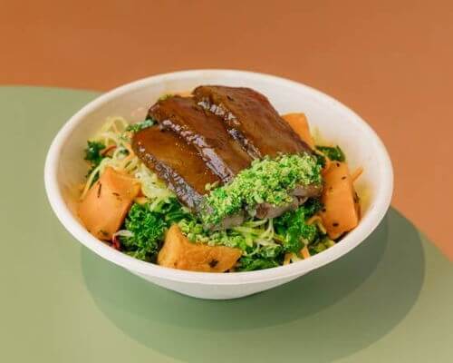 12 hour braised brisket, sweet potato, edamame, cabbage slaw, kale, golden beetroot, wasabi peas, lemon olive oil dressing, teriyaki glaze (GF/DF)