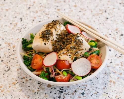 Japanese silken tofu, kale, edamame, cucumber, cabbage slaw, cherry tomato, radish, nori crunch, dill & mustard dressing (V/VG/GF/DF)