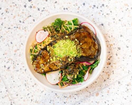 Miso braised eggplant, radish, beetroot, shallots, kale, cabbage slaw, wasabi peas, nori crunch, lemon olive oil dressing (V/VG/GF/DF)