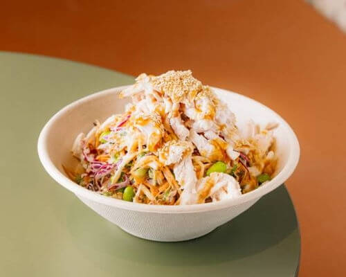 chicken, cabbage, baby spinach, carrot, shallots, onion, parsley, spicy sesame dressing, jalapeño mayo, chilli
