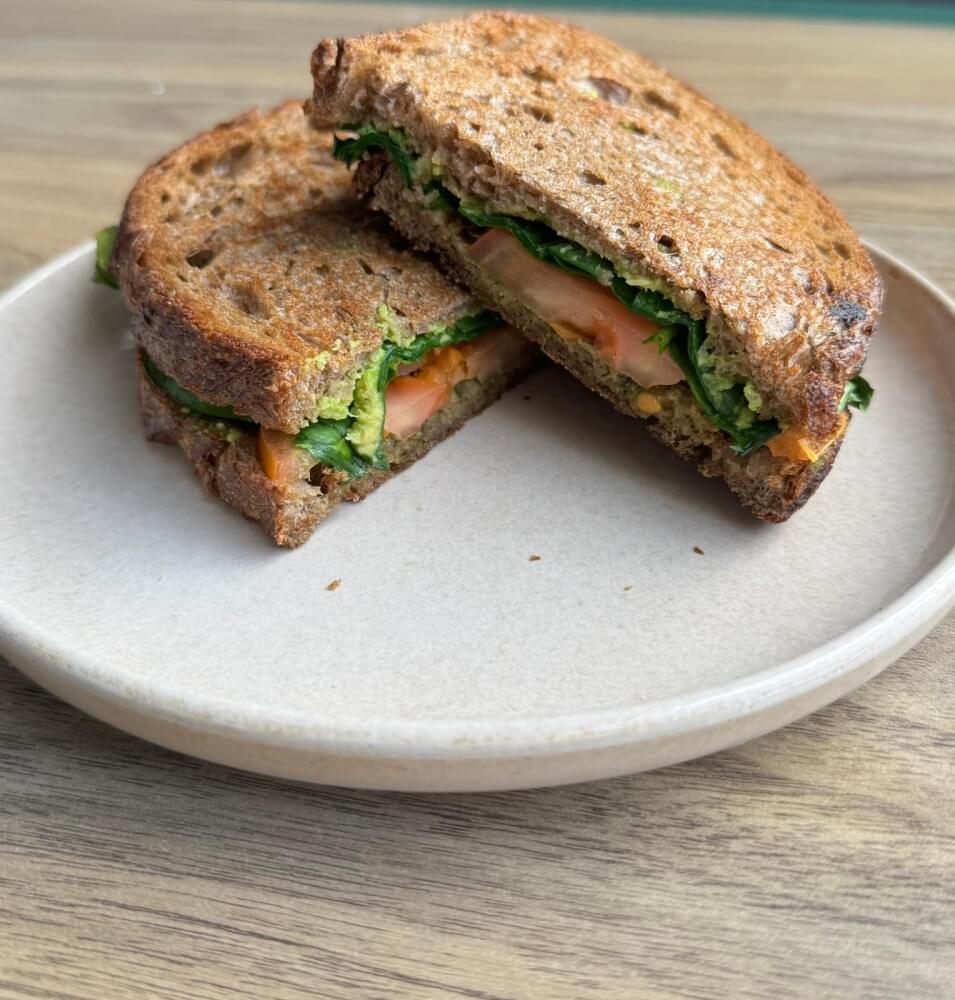 Baby spinach, avo, tomato, basil pesto, rye sourdough